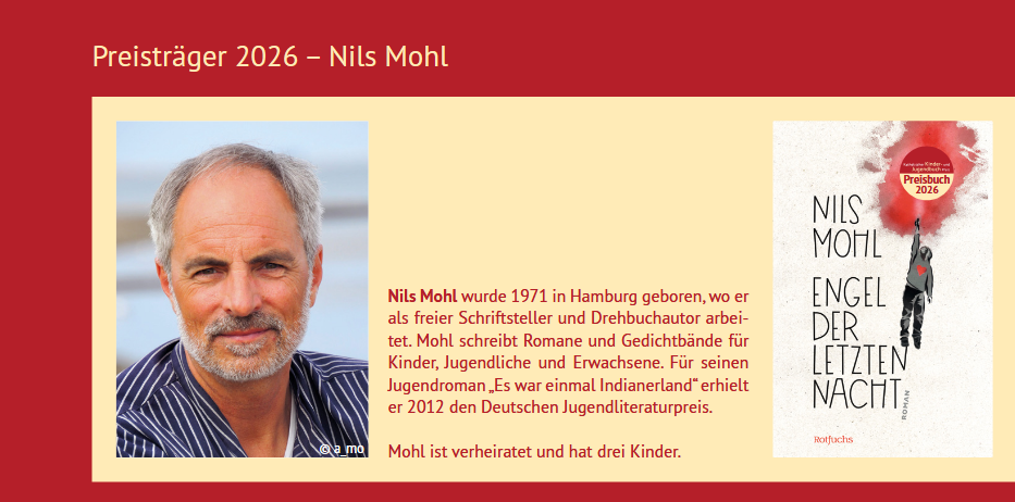 Es erwartet Sie ein inspirierender Abend rund um die Kinder- und Jugendliteratur. Als Dankeschön seitens der Fachstelle erhalten alle angemeldeten und anwesenden Büchereien ein Exemplar des prämierten Buches, „Engel der letzten Nacht“ von Nils Mohl, für ihren Medienbestand. Das bei Rotfuchs (Verlag Fischer-Sauerländer) erschienene Buch richtet sich an Jugendliche ab 14 Jahren.